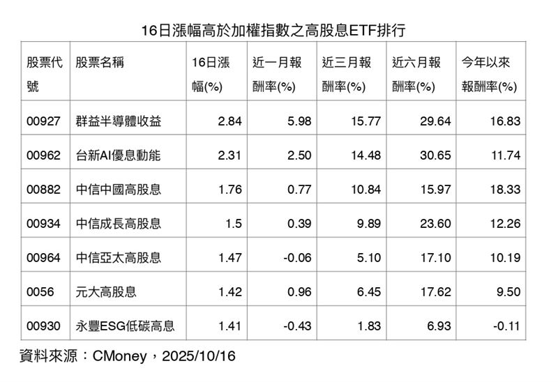 16日漲幅勝過大盤的7檔高股息ETF分別為:群益半導體收益(00927)上漲2.84%、台新AI優息動能(00962)上漲2.31%、中信中國高股息(00882)漲幅1.76%、中信成長高股息(00934)上漲1.5%、中信亞太高股息(00964)上漲1.47%、元大高股息(0056)上漲1.42%,以及永豐ESG低碳高息(00930)上漲1.41%。上述表現顯示在電子類股領漲之際,高股息標的亦同步吸引資金青睞,形成成長與收益兼具的市場結構。